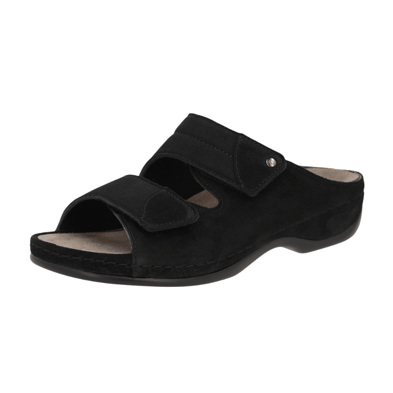 Komfortabler Hausschuh von Berkemann aus schwarzem Wildleder mit Stretch-Einsatz, der sich deiner Fußform flexibel anpasst und für einen besonders weichen Tragekomfort sorgt. Das elastische Design nimmt Druckstellen optimal auf und ist ideal bei Hallux Valgus sowie generell empfindlichen Füßen.