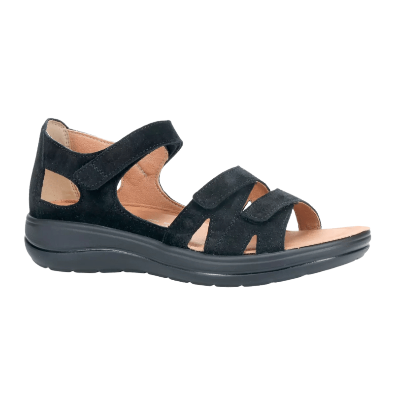 Schwarze Hartjes Damensandale aus weichem Wildleder mit drei verstellbaren Klettverschlüssen, die eine optimale Passform ohne Druck garantieren.
