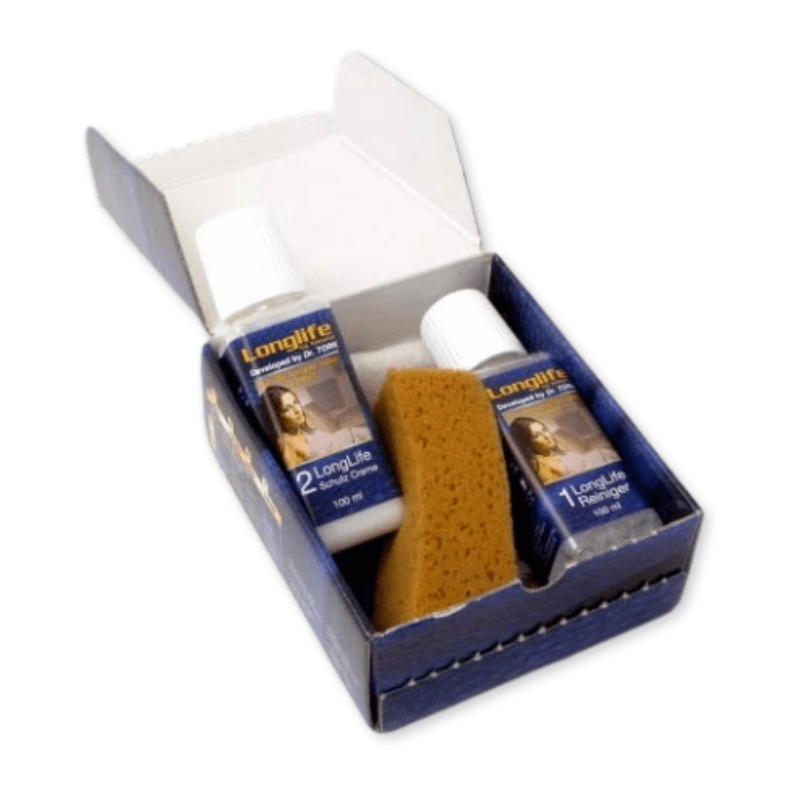 Plejesæt til vedligehold af lædermøbler. Sættet består af en rensevæske, balsam, svamp og klud. Nemt at bruge. Rensevæsken bruges inden balsam påføres. Når du bruger balsam til vedligeholdelse af lædermøbler, tørrer læderet ikke ud og bliver samtidig smudsafvisnende.