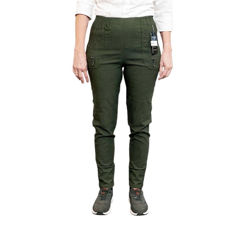 Smarte og behagelige bukser i en dyb olivengrøn farve med fastsyet elastikkant, der passer godt til de flester kropstyper.
