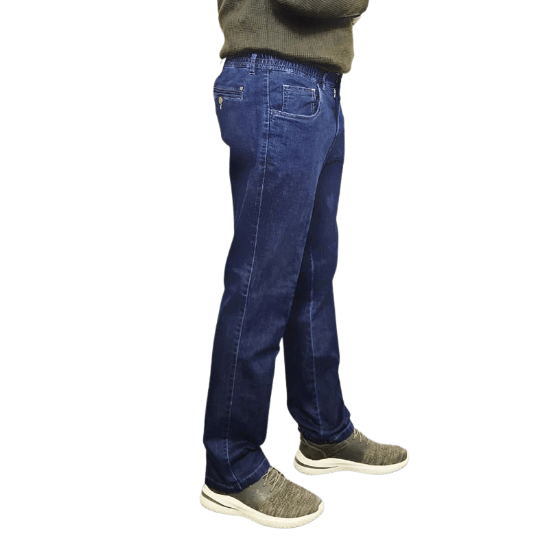 Super behagelige og strækbare jeans eller såkaldte cowboybukser med elastisk linning af høj kvalitet fra Luigi Morini. Bukserne har fine detaljer med dekorative syninger, stropper til bælte og 5 lommer: to baglommer med knap, to sidelommer og møntlomme.
