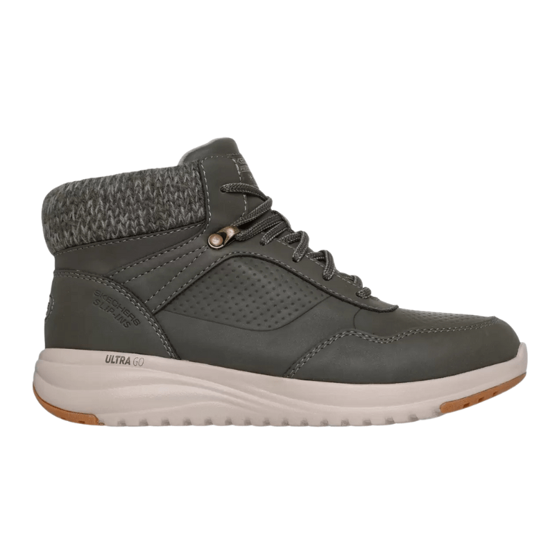 Varm olivengrøn vinterstøvle i vegansk læder fra Skechers. Overfladen er behandlet, så skoen både er smuds- og vandafvisende, hvilket gør den perfekt til vådt og koldt vejr.
