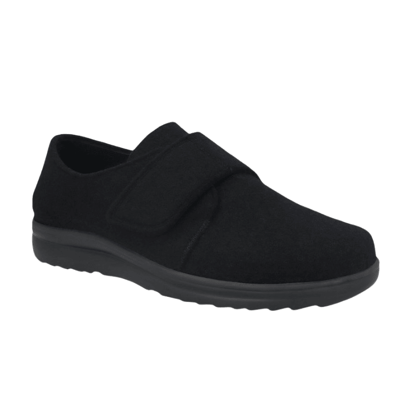 Berkemann Hausschuhe aus dunklem Filz, entworfen mit einem praktischen Klettverschluss, der das An- und Ausziehen sowie die Anpassung an den Fuß erleichtert.