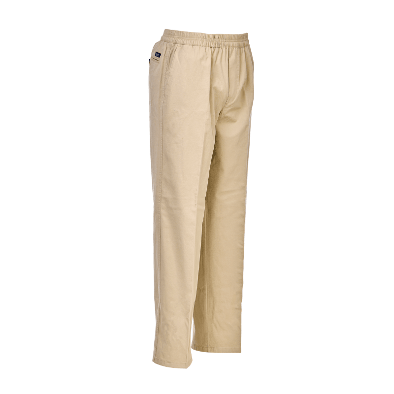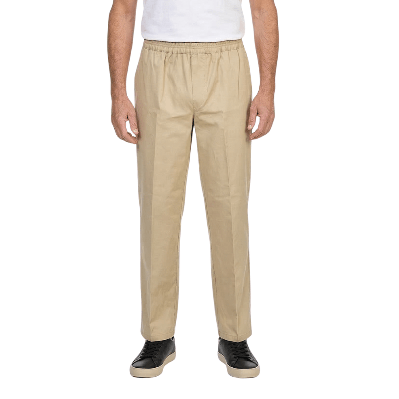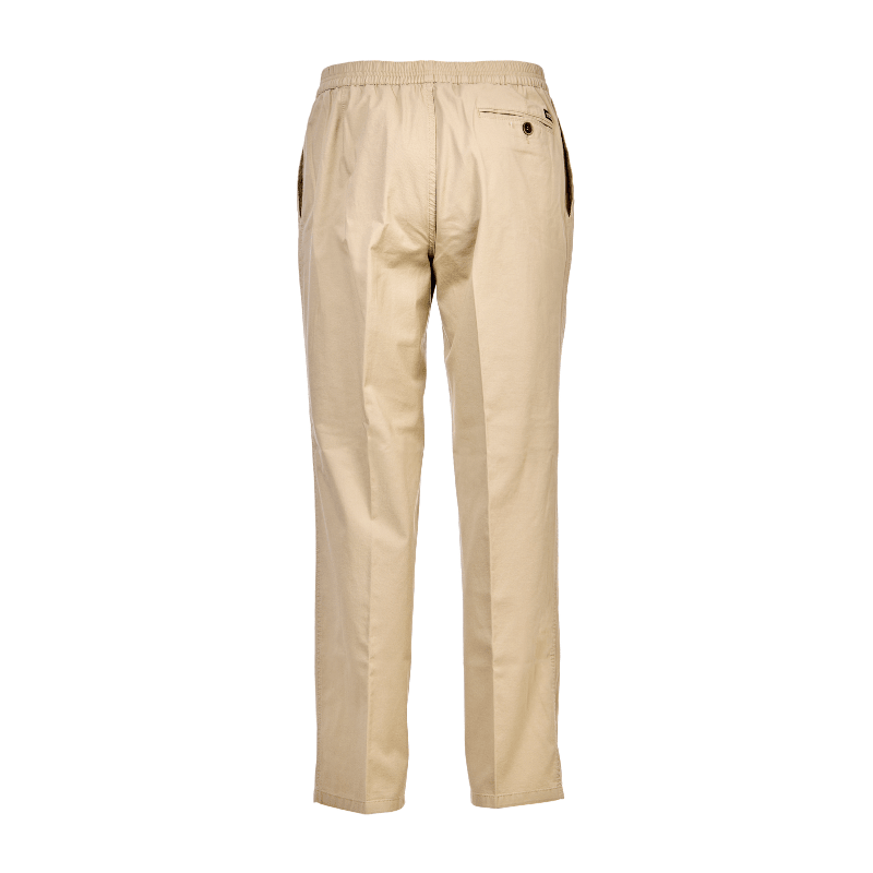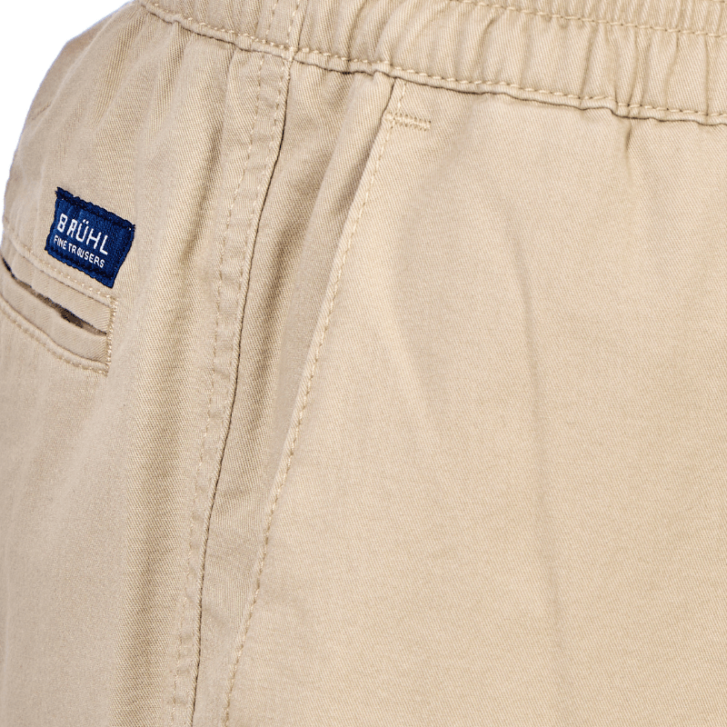 Leichte und klassische beigefarbene Hosen aus weichem Stoff von Brühl mit Gummizug in der Taille – ohne Knöpfe oder Reißverschluss. Die Hosen haben zwei tiefe Vordertaschen und eine einzelne Gesäßtasche mit Knopfverschluss.
