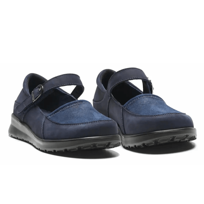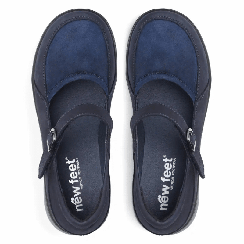 Dunkelblaue New Feet Ballerinas aus weichem, natürlichem Leder mit schicken Wildlederdetails – entwickelt, damit du dich den ganzen Tag rundum wohlfühlst. Dank eines cleveren Klettverschlusses über dem Spann lässt sich der Schuh im Handumdrehen individuell an deinen Fuß anpassen – für optimalen Sitz und maximalen Komfort.