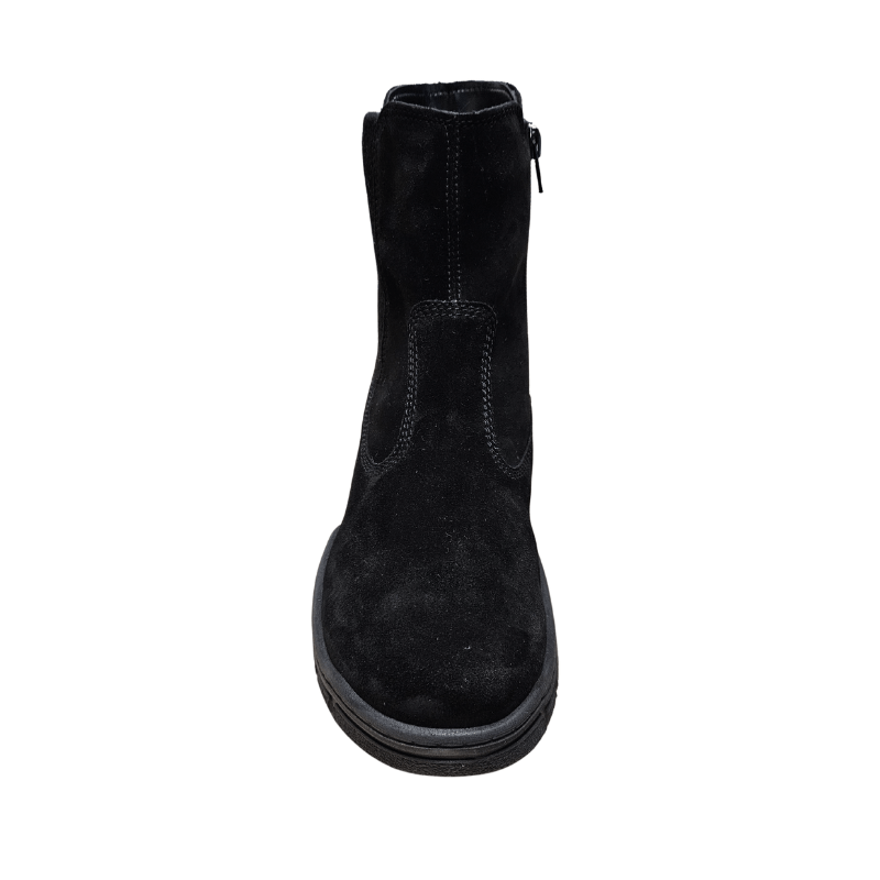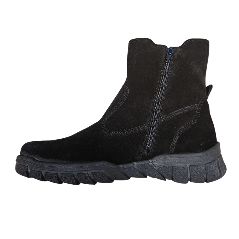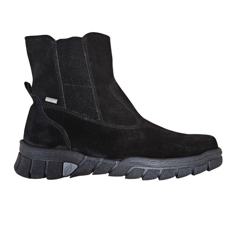 Eleganter schwarzer Winterstiefel von Waldläufer aus weichem Wildleder mit einer äußerst weichen und warmen Fütterung, die für hervorragenden Komfort sorgt – selbst an kalten Tagen. Der Stiefel ist mit einem Reißverschluss auf der Innenseite ausgestattet, der das An- und Ausziehen erleichtert.